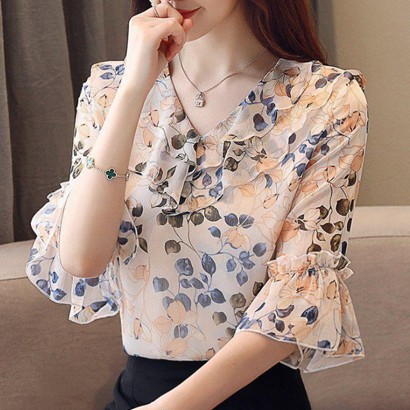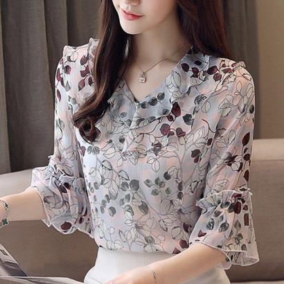 เสื้อเชิ้ตผ้าชีฟองลายดอกไม้สวยสง่าดูดี
